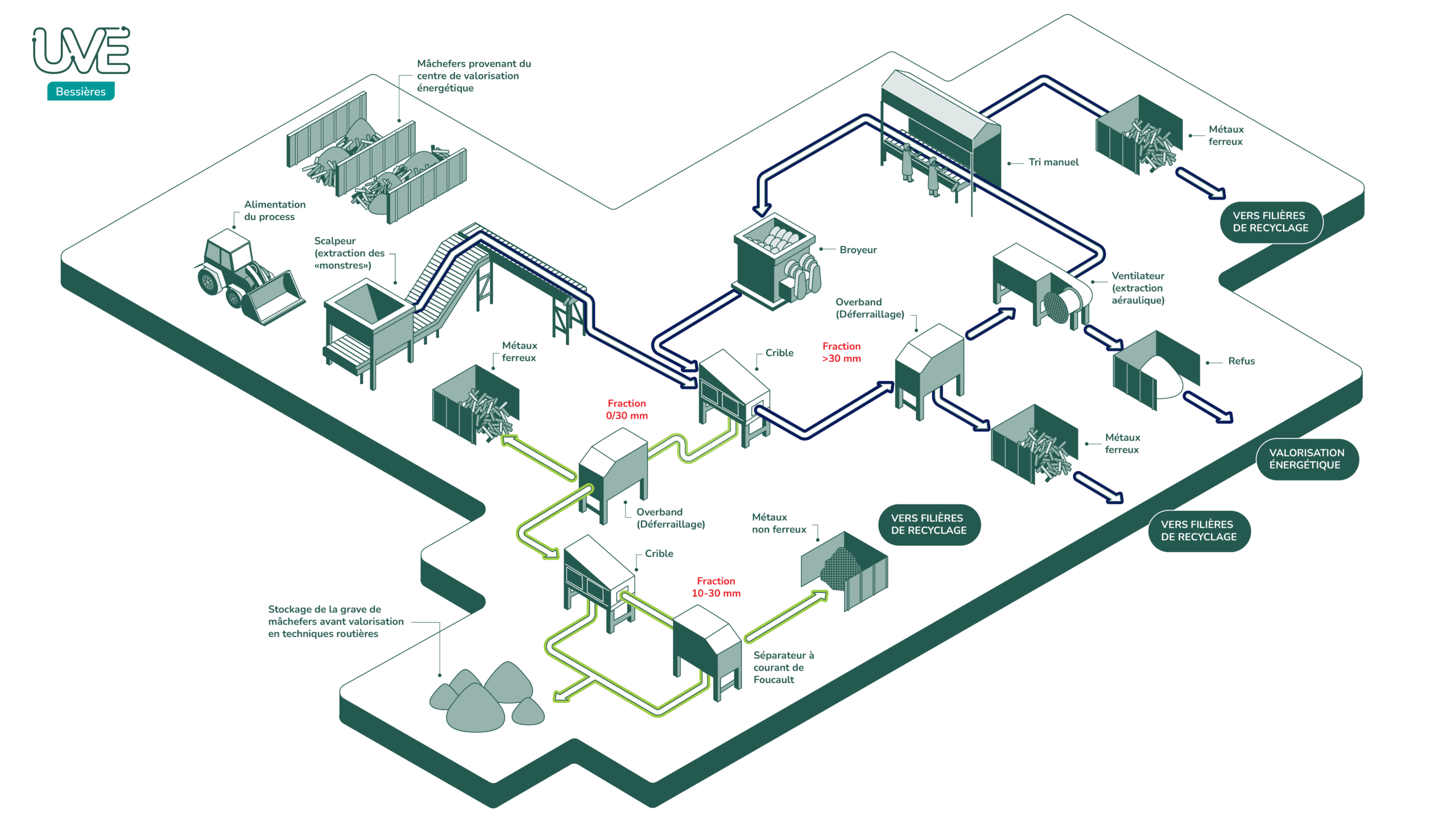 Les mâchefers issus de l’Unité de Valorisation Énergétique (UVE) de Bessières sont traités directement sur place, au sein du centre de valorisation dédié. Cette organisation permet d’éviter le recours au transport routier et de réduire ainsi les émissions de CO₂. Ils sont transformés en matériaux utiles pour les travaux publics.