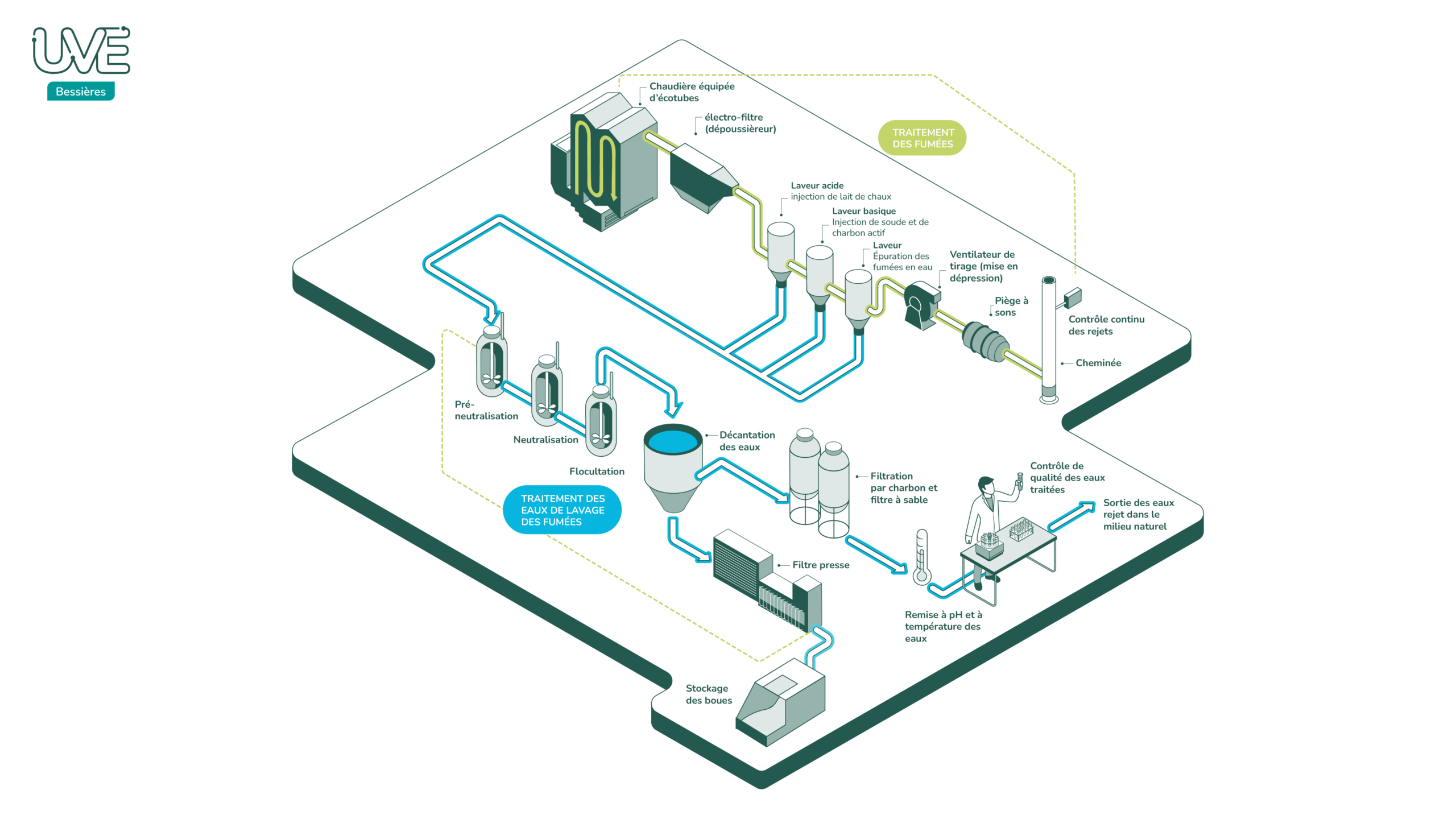 Les eaux utilisées pour le traitement des fumées subissent un traitement physico-chimique dans une station d’épuration in situ. Une fois épurée et contrôlée, l’eau claire produite est rejetée dans le milieu naturel.