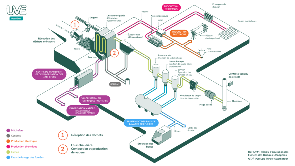 Mise en service en 1998, l’Unité de Valorisation Énergétique (UVE) de Bessières, incinère près de 176 000 tonnes de déchets par an et les valorise sous forme d’énergie.