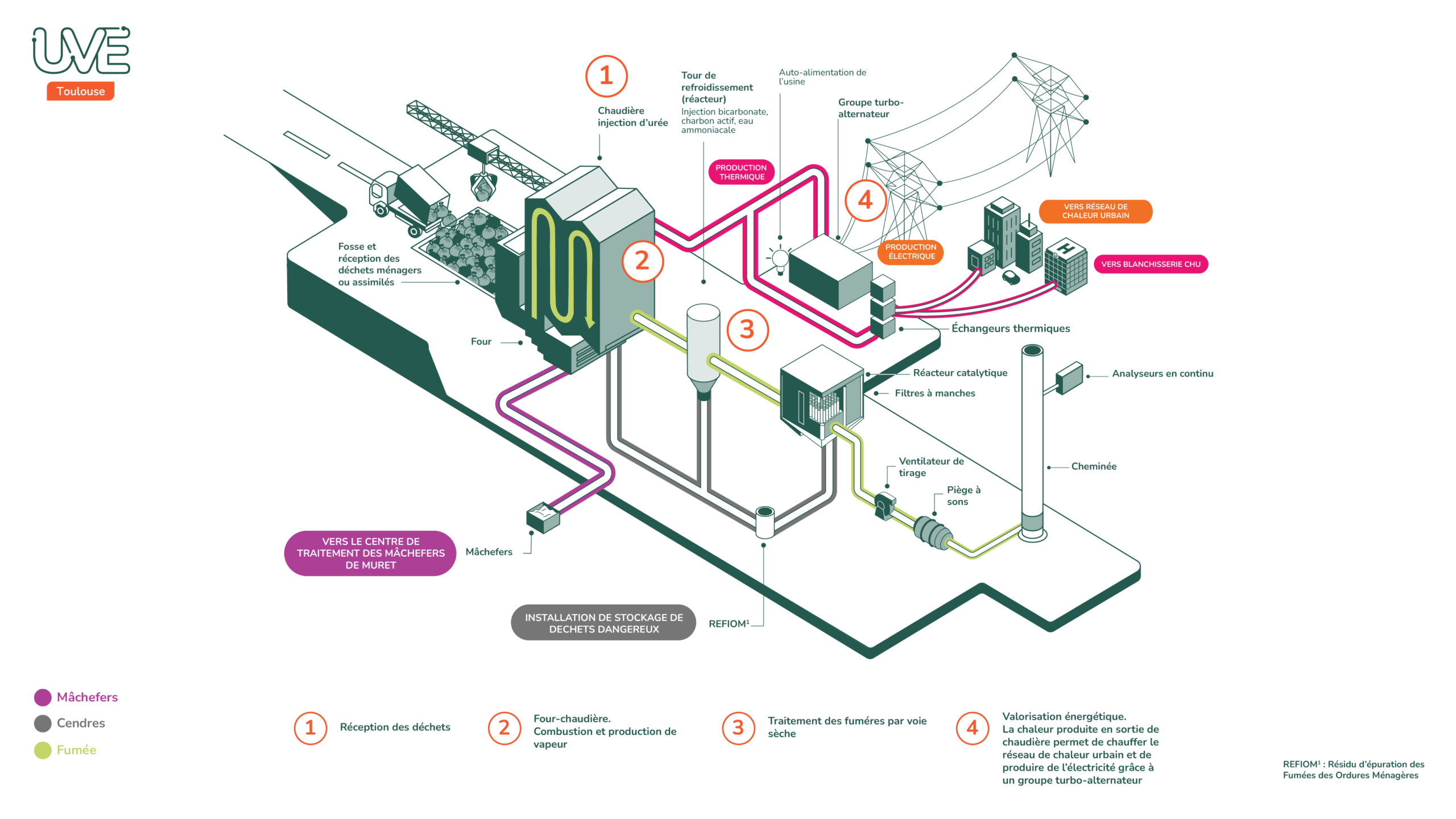 - Combustion au sein des fours alimentés par un grappin depuis la fosse de stockage des déchets. L’Unité de Valorisation Énergétique de Toulouse dispose de quatre lignes de combustion : trois lignes équipées de fours à grille Martin pouvant traiter chacune 10 tonnes de déchets par heure, et une ligne avec un four à rouleau capable de traiter 14 tonnes par heure ;
