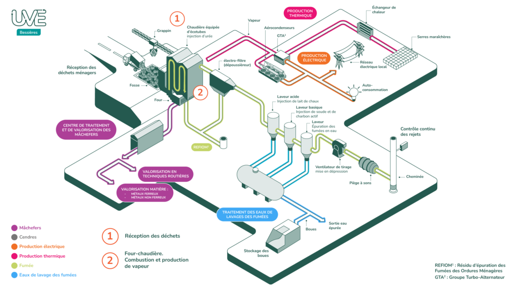 L’UVE de Toulouse transforme la chaleur issue de la combustion des déchets en électricité et en chaleur pour le réseau de chauffage urbain.